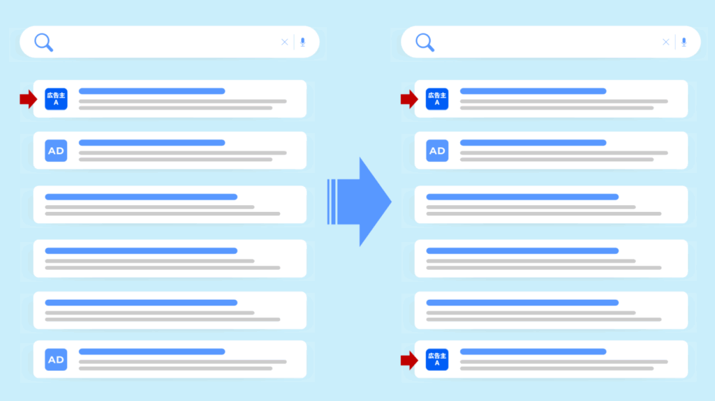こちらがクリック率低下の核心です。一般的に、検索結果ページの「下部」に表示される広告は、「上部」に表示される広告に比べてクリックされる確率(CTR)が低い傾向にあります。